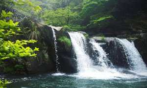 三叠泉在庐山五老峰东面,青莲涧的下源,亦称三级泉.水帘泉。于宋光宗绍熙二年(1191年)始被樵夫发现。三叠泉汇集了五老峰和大月山两处约2平方公里的溪流,沿第四纪冰川形成的冰阶,辗转盘旋,喷空而下,沿着三级断崖,分为三叠形成瀑布直泻龙潭,落差达155米。一叠直垂,像一面水晶帘子,从20多米的簸箕背上一倾下,砸在苍崖上,浪花翻滚,烟雾腾腾,白浪飞溢,溅起亿万珍珠,远看似雨雪交加,近看似大雾茫茫。二叠落差50米,“飘者如雪,断者如雾,缀者如旒,挂者如帘”。三叠最长最阔,洪流倾泻,满满荡荡,如玉龙走潭,巨响轰磕,飞瀑跌落处激起了滚滚波涛,浪花四溅。观三叠泉分俯视与仰视两种,一为出青莲,涧河谷,由观瀑亭与六合亭等处俯视,一为从铁壁峰向上视。气势磅礴的三叠泉,其景色随着季节和雨水多寡的变化而不同。暮春初夏多雨季节,飞瀑如发怒的玉龙,轰然疾下,震天动地。仲夏严冬雨水较少,则水帘如丝,风吹轻烟,轻盈柔美。春夏秋冬四季,各有千秋。三叠泉秀美险奇,自古被誉为“庐山第一奇观”,又有“匡庐瀑布,首推三叠”,“不到三叠泉,不算庐山客”之说。历代诗人曾为之讴歌赞美。元代诗画家赵孟兆《水帘泉》诗云:“飞泉如一帘,直下数千尺。新月如帘钩,遥遥挂空碧”。对三叠泉的月夜作了诗情画意般的描述。宋代诗人白玉蟾《三叠泉》诗云“九层峭壁划青空,三叠鸣泉飞暮雨”,“寒山入谷吼千雪,派出银河轰千古”等诗名。从观瀑亭绕道下行,可临“观音洞”和“观音崖”,洞旁巨石上镌有邓旭所书的“竹影疑踪”四字。相传此处为仙人洞“竹林隐寺”的石门。民间流传的樵夫洞中观神仙下棋,“洞中方七日,世上几千年”的神话传详,即指此处。